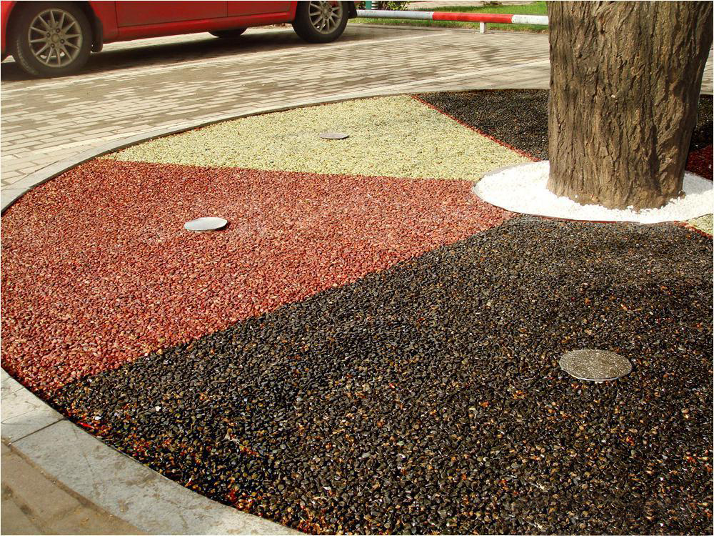 膠粘石透水路面是由改性高分子樹脂為膠結(jié)材料,將天然彩石、拋光色石、玻璃、水晶石、人造骨料等牢固地粘接在一起,鋪設(shè)在混凝土、透水混凝土、瀝青或級(jí)配砂石基層上的生態(tài)景觀地面鋪設(shè)材料,具有高效透水、自然美觀、色彩多樣、經(jīng)久耐用等特點(diǎn)??捎糜谕杆跃坝^道路、車型或人行道、公園和廣場(chǎng)等場(chǎng)所,也可應(yīng)用到室內(nèi)場(chǎng)所。